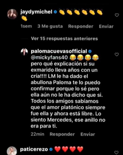El tema es que a pesar de que el texto estaba escrito en el perfil aparentemente oficial de Cuevas, Paloma hablaba en tercera persona contestando a un perfil absolutamente desconocido que había interaccionado en el muro de Genoveva. Este hecho provocó que inmediatamente el resto de los perfiles de la conversación la acusaran de usar cuentas falsas, fabricadas, para cuestionar y criticar abiertamente a su exmarido y a la novia de este.