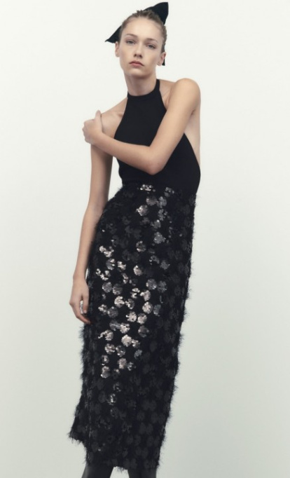 Pues sí, el punto también puede ser muy apropiado para una fiesta de Nochevieja. La prueba está en este vestido midi de Zara con cuello halter, espalda descubierta y falda de tejido efecto pelo y aplicación de lentejuelas al que no se le puede poner un pero.