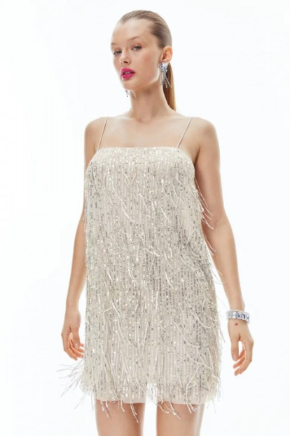 Es el color estrella de este invierno, así que ¿porqué no recibir el Año Nuevo vestida de blanco?. Divertido y con un corte muy simple de cuerpo recto y tirantes espagueti, este vestido de H&M le deja todo el protagonismo al tejido de malla bordada con lentejuelas plateadas y flecos muy años 20.