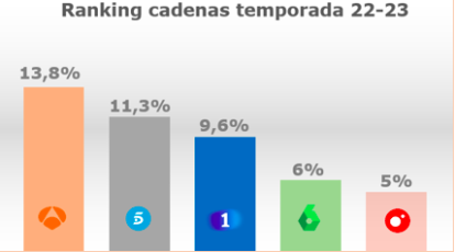 De esta forma, la temporada quedar liderada claramente por Antena 3 con un 13'8% de cuota de pantalla, que de esta forma se impone por goleada a Telecinco (11'3% share). En tercer puesto del ranking queda La 1 de TVE, con un 9'6%. En la batalla de las 'segundas cadenas' también se impone La Sexta (6%) a Cuatro (5%).