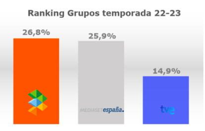 Por grupos, Atresmedia -con un canal menos que la competencia- se impone también a Mediaset España. Los de San Sebastián de los Reyes logran un 26'8% frente al 25'9% de los de Fuencarral. Muy por detrás queda el grupo de Radio Televisión Española (RTVE) con un 14'9% de cuota.