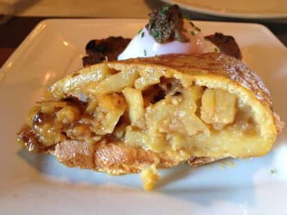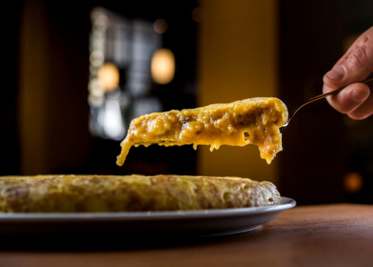 Comenzamos por la ganadora del concurso de La mejor tortilla de patata de la Comunidad de Madrid, organizado por la Asociación de Cocineros y Reposteros de Madrid y celebrado el pasado 7 de marzo. Manuel González Cordero se proclamó campeón con una tortilla muy cremosa, pero sin que chorree el huevo), y con la cebolla caramelizada (cuenta que la receta está inspirada en su madre, a quien no le gustaba encontrarse la cebolla cruda). El pincho se vende a 2’5€, y la tortilla entera a 12’50 €.