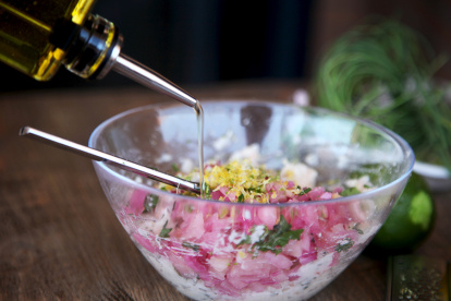 1.- Con ayuda de un tenedor aplasta las judías blancas cocidas hasta obtener una crema tosca. Incorpora el pepino, la cebolla encurtida picada en brunoise (pequeños dados de 1 a 2 mm de lado), la albahaca y el eneldo picadito, sal, pimienta, aceite de oliva, jugo de lima al gusto y mezcla hasta que esté bien combinado.
