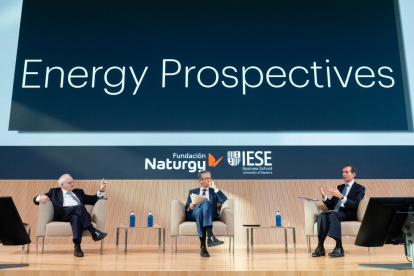 El editor adjunto del Financial Times, Martin Wolf, y el gobernador del Banco de España, Pablo Hernández de Cos, han participado en la octava edición del ciclo de conferencias Energy Prospectives, organizado por Fundación Naturgy y el IESE Business School, que inauguraron el presidente de Fundación Naturgy, Rafael Villaseca, y el director general del IESE, Franz Heukamp.