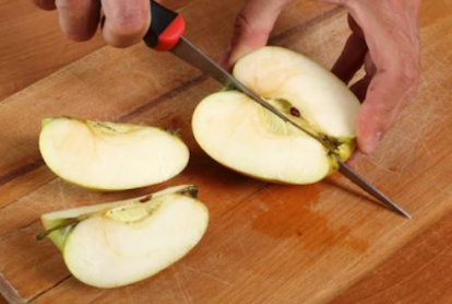 - Cuando falte poco para finalizar el tiempo de horno, pelar las manzanas, retirar el corazón y córtalas en rodajas delgadas con un cortador o mandolina.