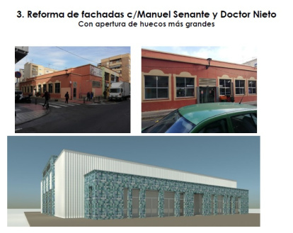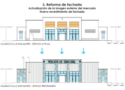 Además, se prevé reconfigurar la fachada existente en las calles Manuel Senante y Doctor Nieto, así como se va a actualizar la imagen del mercado, con la incorporación de nuevos revestimientos de fachada que definan una imagen urbana más contemporánea, con paneles en base de acero galvanizado y prelacado con perforación.