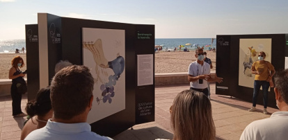 La segunda parada de la singular exposición de la DOP Alicante, que cuenta con tres generaciones de ilustradores con estilos y técnicas diferentes, está ahora situada con el mar de fondo en pleno paseo Marítimo, a la altura de la Peña y cerca de la Lonja del Pescado. El Consejo Regulador ha elegido El Campello como lugar de exposición, por ser donde se ubica el importante yacimiento con restos de bodega como son Los Baños de la Reina.
