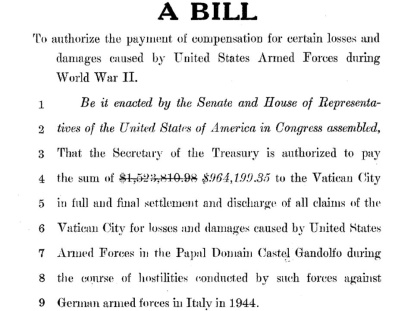 El Vaticano reclamaba a la administración norteamericana el pago de 1.523.810,98 dólares en concepto de reparaciones realizadas en las dependencias papales tras los daños que sufrieron durante los bombardeos de 1944.