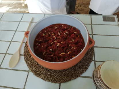 Las cuatro finalistas han heredado un legado culinario que procede de sus ancestros. Amparo Cosido la aprendió de la abuela de su marido. Ella, antes de que se produjera la degustación esta mañana, ha explicado la técnica aplicada de sofreír el pimiento, luego la tonyina, el ajo, el tomate (de lata o natural, depende de en qué época del año la haga) y, a mitad de cocción, añadir los piñones. Después, una combinación de azúcar y sal hasta encontrar el punto, e ir probando constantemente para detectar el gusto idóneo. "Lo ideal es utilizar una cazuela de barro", ha añadido.