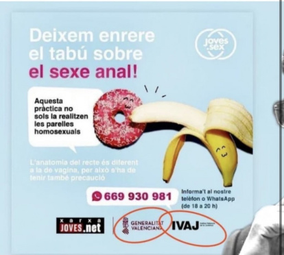 Con un feliz donut rosa y un sonriente plátano a medio desnudarse de su cáscara, el cartel del anuncio pide “dejar atrás el tabú sobre el sexo anal” porque “esta práctica no sólo la realizan las parejas homosexuales”. Junto al logo de la Generalitat y del Instituto de Valenciano de la Juventud, el cartel incluye un número de teléfono, páginas web y sistemas de atención personal para atender a los interesados en adentrarse en el mundo del sexo anal.