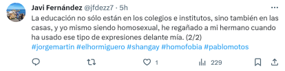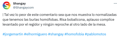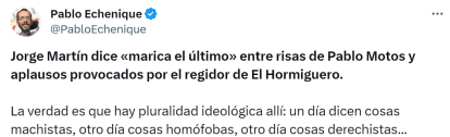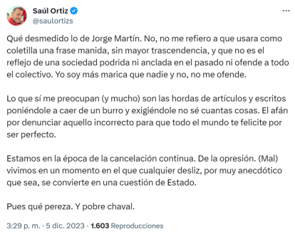 En el vídeo se puede ver como Martín no sabe muy bien cómo terminar la frase y suelta un comentario que, una cosa no quita la otra, no debe decirse en pleno año 2023. Más allá de ello, el linchamiento en redes sociales ha sido un tanto exagerado y más teniendo en cuenta el contexto. Por supuesto, con Echenique y comopañía sumándose al mismo a la mínima que han podido.