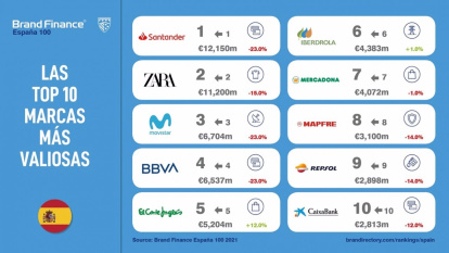 De esta forma completan el ‘top 10’ de las marcas más valiosas BBVA, que ocupa la cuarta plaza, seguido por El Corte Inglés e Iberdrola, las únicas marcas entre las 10 mejores que sube su valor de marca un 12% y 1%, respectivamente, Mercadona, Mapfre, Repsol y Caixabank.