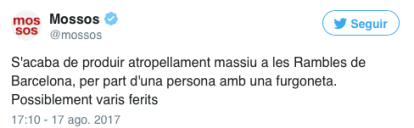 Una furgoneta ha atropellado en la Rambla, en Barcelona, a un grupo de personas a la altura del cruce con el Carrer Bonsuccés. La furgoneta ha recorrido el paseo central de la Rambla de Canaletes y se ha estrellado contra el segundo kiosko de la avenida. Las autoridades no hablan aún de atentado, algo que sí han hecho algunos medios barceloneses.