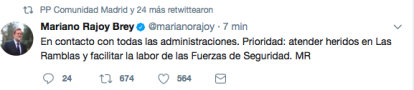El presidente del Gobierno, Mariano Rajoy, ha dicho en Twitter: "En contacto con todas las administraciones. Prioridad: atender heridos en Las Ramblas y facilitar la labor de las Fuerzas de Seguridad. MR".