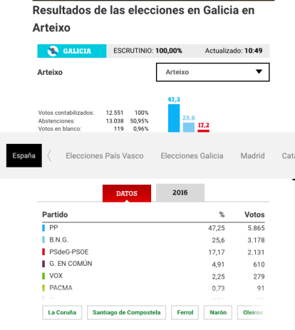 Baste una ojeada a las cifras. El 12-J acudieron a las urnas en Arteixo 12.551 personas. El PP logró el 47.2% de los votos, el BNG el 25.6%, el PSOE el 17.1% y Galicia en Común (la marca de Podemos), el 4.9%.