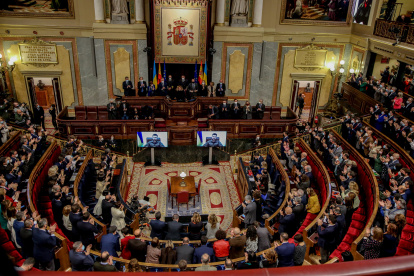 Máxima expectación en el Congreso de los Diputados para escuchar la intervención del presidente de Ucrania, Volodimir Zelenski, ante el pueblo español. Ningún ministro, diputado o senador a izquierda y derecha ha querido perderse la intervención, una de las pocas del Hemiciclo en su historia que ha logrado el aplauso unánime de todas sus señorías. Una alocución, con presencia en la tribuna de los embajadores de la OTAN, que forma parte ya de la historia parlamentaria.