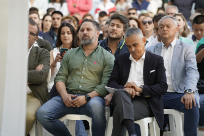 El presidente de Vox, Santiago Abascal, y el candidato de Vox a la Presidencia de la Junta de Extremadura, Ángel Pelayo Gordillo