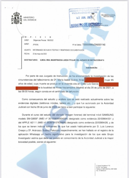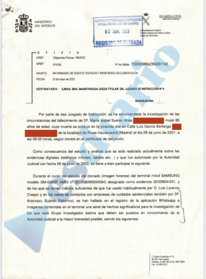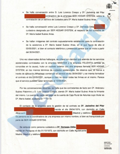 Así, tras revisar los terminales móviles y las aplicaciones de mensajería, el informe de la Guardia Civil concluye que: “se infiere con claridad que además de los servicios asistenciales contratados con la empresa MASVIDA y la empresa FELIZVITA (ambas ya conocidas en la causa), hubo un contrato anterior con otra empresa llamada SER HOGAR SYSTEM, en los mismos términos de cuidados asistenciales. Se observa que, al menos a través de aplicación WhatsApp comienzan el servicio el día 30/04/2021 y se intenta formalizar el contrato el día 03/05/2021, aunque si bien no obran todas las firmas en el mismo. Parece que el servicio pudiese haber terminado el 10/05/2021”.