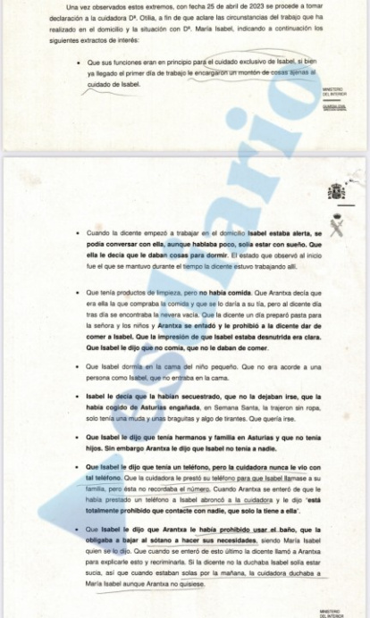 “La impresión de que Isabel estaba desnutrida era clara. Que Isabel le dijo que no comía, que no le daban de comer”, esto figura en el informe de la Guardia Civil -con fecha del 23 de mayo del 2023-, al que este periódico ha tenido acceso en exclusiva, a raíz de la declaración de la cuidadora de María Isabel Suárez, la tía de Arantxa Palomino -la mujer del actor Luis Lorenzo-.