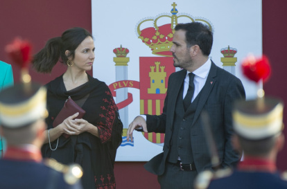 La ministra de Derechos Sociales, Ione Belarra, coleta al viento con un pañuelo bordado por mujeres palestinas, junto al ministro de Consumo, Alberto Garzón