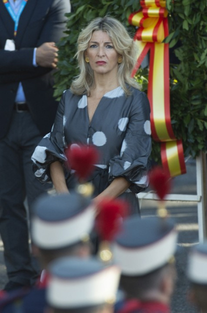 La ministra de trabajo, Yolanda Díaz, ha elegido un vestido de lunares para celebrar el día de la Virgen del Pilar